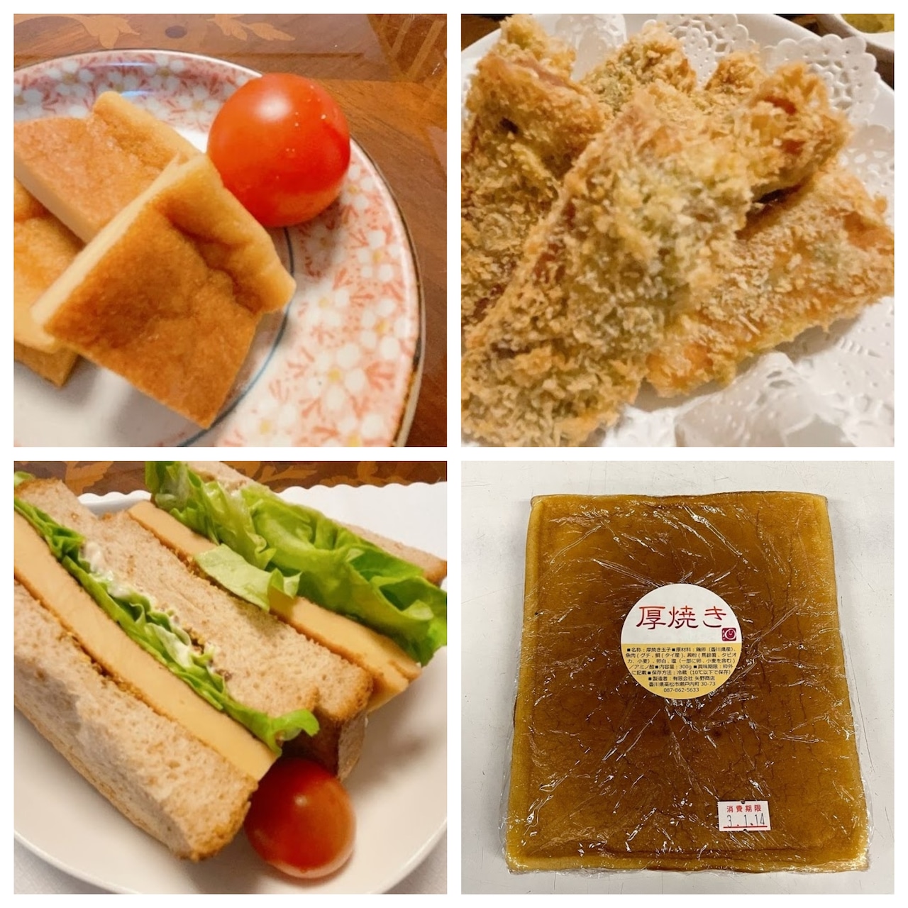 【原材料名】鶏卵(香川県)、魚肉(グチ・イトヨリダイ(タイ産)、澱粉(馬鈴薯・タピオカ・小麦)、卵白、塩、菜種油